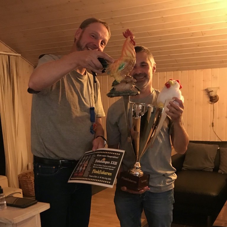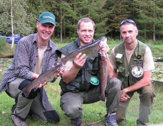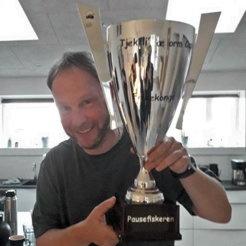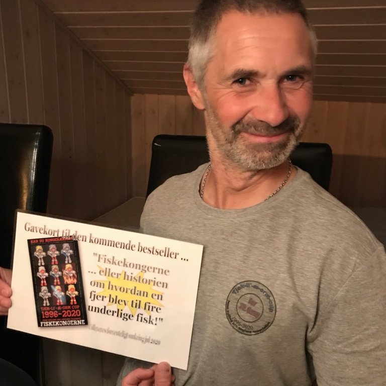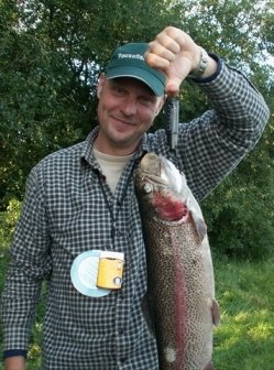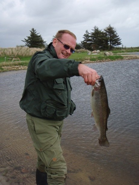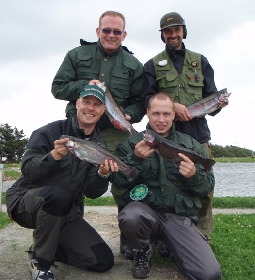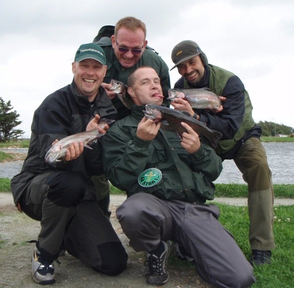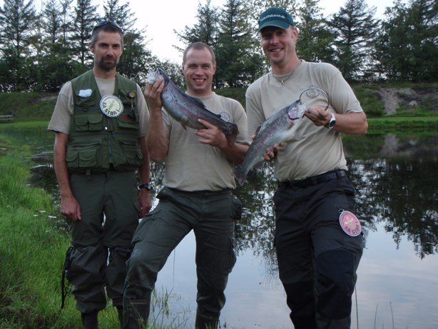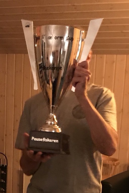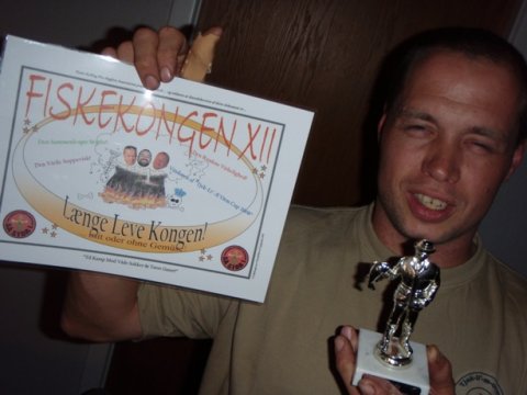 Fiskekongen XVI Den Pausefiskende takker de tro væbnere for en tilpas stridslysten dyst ved den store Fiskesø-flod i det vestjyske! Ja, egentlig var det vel kun Flinkfiskeren der seriøst også prøvede at kroge kongetitlen, som mulig vinder af "Tjek-Li-Æ-Orm Cup 2012". Turisten nøjedes med at prikke lidt til ørredgummer med sine slidte kroge og Fynboen forsøgte blot at holde sig tør i år!? Så afgørelsen skulle vel falde imellem de flotte, men knap så store, bækørreder, som Flinkfiskeren & Pausefiskeren så atletisk havde fightet? Næh! 57 cm velfightende regnbueørred fristet af skalreje gjorde en royal forskel - da Turisten og Pausefiskeren skulle til at gå i gang med kaffe & kage! Hil Pausefiskeren! Heldigvis var der ved den efterfølgende Gallamiddag trøstepræmier til dem uden "fiskefingre": Fynboen fik overrakt en "rigtig flot" regnbueørred støbt i glas ... mens Turisten fik overrakt den fiskestangsimiterende sølvfarvede "fighterpokal" med en friskfanget dåse fiskeboller! Tillykke!