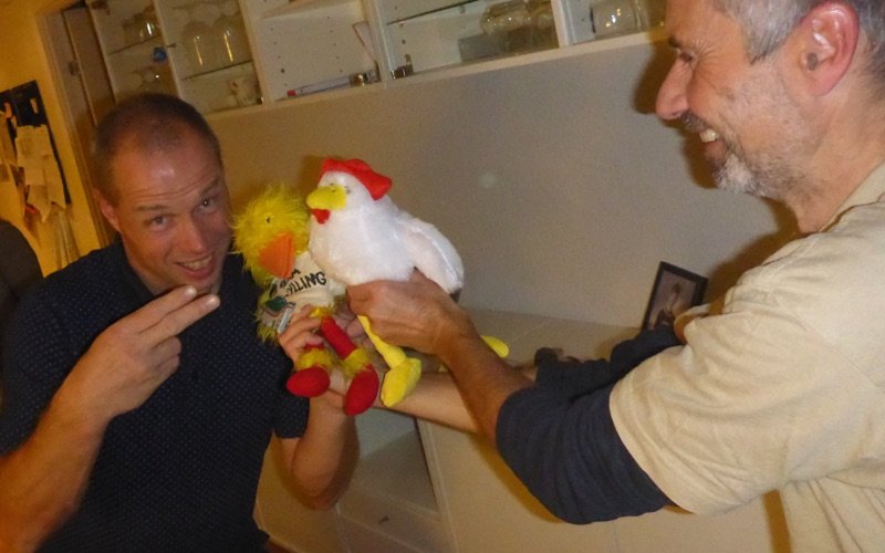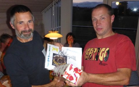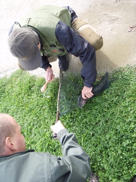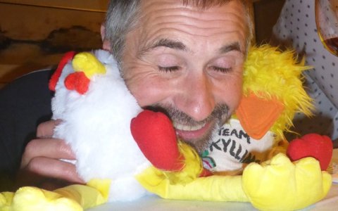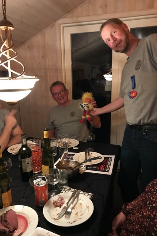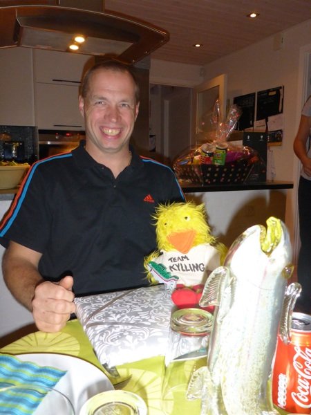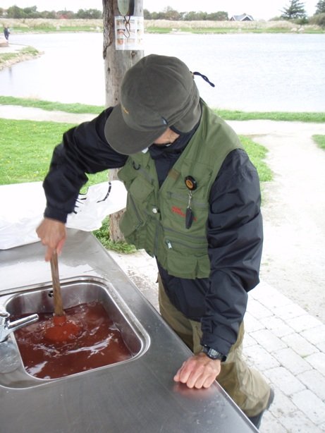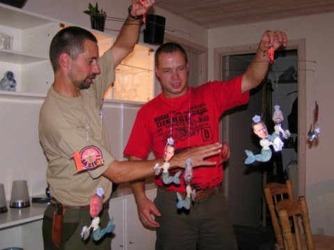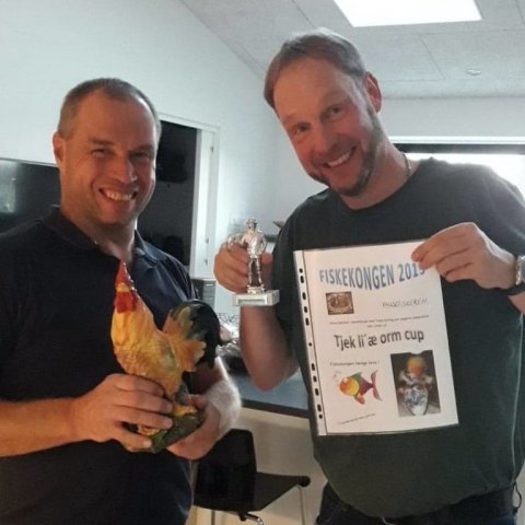 For 18. gang mødtes de tidligere atleter fra Team Kylling Volleyball til en omgang "Tjek-Li'-Æ-Orm Cup"! Fynboen havde skaffet fornem arena for årets dyst i det gamle brunkulsleje - med økologiske fisk! Og selvom sidste års vinder efter 5 minutter forsøgte at give de andre kombattanter en chance ved at slå det første hug af en ilter regnbueørred af krogen - måtte Pausefiskeren alligevel erkende 12 minutter senere, at de små fedtfinner bare ville ham denne dag! Så faldt der ro på sagerne - kun afbrudt af Fynboens småbrokken over misset hug - og ikke mindst Flinkfiskerens knap så flinke udbrud over en slanget og slimet ål - der huggede kontant, da han stod og besværgede stangtoppen med sort magi! Lige omkring dommerens sidste fløjt for konkurrencen ... eller var den over? ... krogede Turisten en stærk fisk, der i deltagernes øjne lignede en vinder! Men ved indvejningen kom chokket: Pausefiskerens regnbueørred vejede næsten 20 gram mere! Sikke en suveræn afgørelse! Herefter "Same procedure as Every Year" ... Gruppefoto, Galla, hyggelig festivitas og præmieoverrækkelser! Pausefiskeren blev "kronet" som Fiskekongen d. XVII ... og Flinkfiskeren modtog i dagens anledning glasfisken for grimmeste fangst! Og så kom kyllingen også med til Esbjerg!