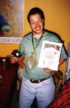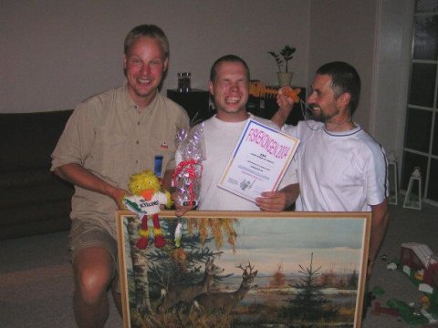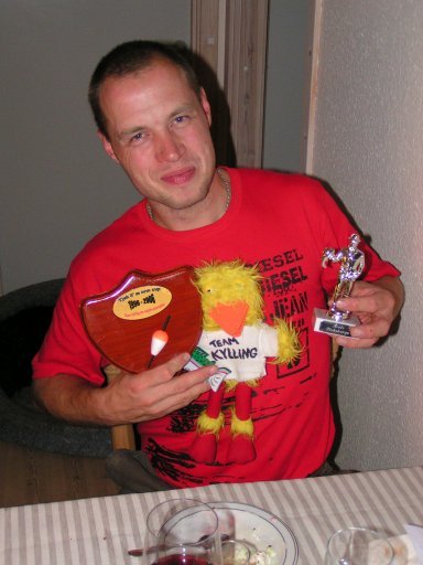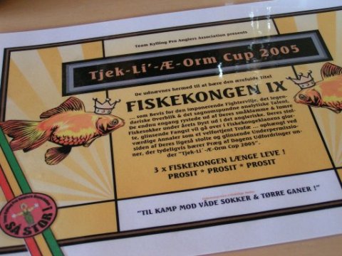 Tjek-Li'-Æ-Orm Cup 1996-2006 - 10 års Jubilæum ! Ikke et øje var tørt, da broderskabet tørnede ud til Jubilæumsdysten i Lystfiskergårdens vande - der hvor "The Member former known as Fynboen" kastede sin rustne Mepps og blev den første Konge! FLINKFISKEREN havde styr på det hele - chauffør i japansk limousine, aktiviteter til Dronningerne og Kronarvingerne, senere en lækker Jubilæumsmenu og rigeligt med våde varer til at skåle med ! Men det med regnbuer gik lidt gal! Først kort før "indvejning" poppede TURISTEN frem - stadig lidt rødkindet efter heftige forhandlinger med en grådkvalt tysker? - stolt fremvisende en doven junior-regnbue med rusten fluekrog i ryggen og et 28 grams Hansen Flash i kæften! Hil den nye Konge - trods alt! Jubilæumsfesten derefter rykkede heldigvis mere i snøren - og ikke kun ved FLINKFISKEREN og TURISTENs bøvlen rundt med den fine højtidsgave fra PAUSEFISKEREN: The Original Team Kylling Pro Anglers Association Gør-Det-Selv 10-års Jubilæums-uro - anerkendende ros til de 2 handymen i den sene aftenstund! Endnu en gang STOR TAK til FLINKFISKEREN - med sin Dronning - for det fine arrangement - Det fine Jubilæumsskjold er hængt op på et gyldent søm i "Æ' Pralstow"!