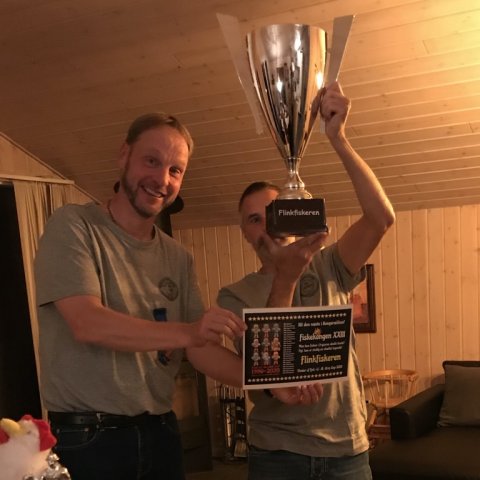 I FYNBOENs (og det ”Fynske Fiskeskræmmer Karma”s ?) fravær lykkedes det at score fuldt hus ved årets Cup! PAUSEFISKEREN nuppede dog vinderfisken i 6. kast, så var presset jo væk fra fiskebrødrenes smalle skuldre - og sammen kunne de bl.a. nyde den dobbelte Fiskekonges (fejl)kast over TURISTENs fiskeplads, hvor en bonus-regnbue glædeligt huggede på gennemløbspirken! VÅDE SOKKER kan endeligt bevise, at han har været med i en Cup med sin historiske regnbuefangst - og TURISTEN kunne ikke spise meget af konens Galla-buffet ved hjemkomsten … når nu spinnerkøb i fiskesøens kiosk udløser en fransk hotdog … HVER GANG !