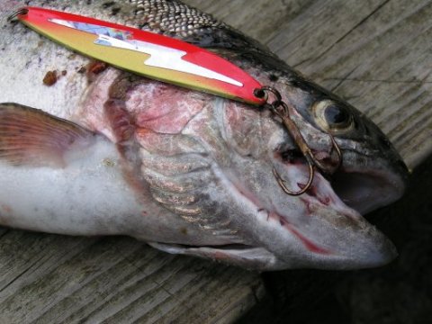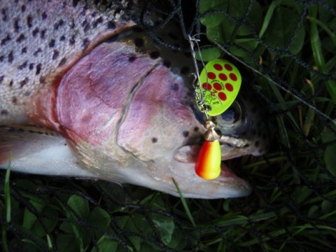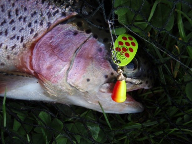 TURISTEN havde fået svigermors runde fødselsdag fra ’97 ud af kroppen … og førte sig straks ublu frem med 2 fine regnbuer … lokket i fordærv af en hjemmelavet spinner! Den strålende agn forsvandt lidt senere i gabet på en virkelig vinderfisk … som så forsvandt med spinneren - og 45 meter af den efterhånden møre line, som TURISTEN fik i konfirmationsgave.
