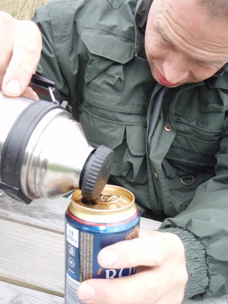 Da Flinkfiskeren endeligt hælder Kaffe i sin kop.