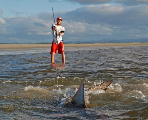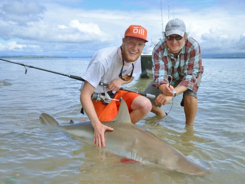 Hvad skal man dog lave i juleferien, mens man venter på det det nye år. Nåh ja, tage ud og fiske sammen med vores gode ven Nikolaj (Nik) Matthiasen. Nik har guidet halvdelen af sit liv på New Zealand og kender alle de gode fiskepladser på Nordøen. Han inviterede os på julehygge hjemme hos ham og konen med julemad, mojitos og slap-af-tid! Men slap-af-tid for Nik betyder ikke at sidde i en sofa og se fiskefilm dagen lang. Slap-af-tid betyder hajfiskeri i Tauranga. Hans toptunede fiskebåd, som han til hverdag bruger til at optage New Zealand største fiskeprogram Big Angry Fish, bliver proppet med korte kraftige stænger, hjul med 80 punds fletline og fire store bonito til madding. Der går ikke lang tid, før linen på Nikolajs hjul bliver flået af, af en hidsig haj. Den kæmper voldsomt og tager et par korte udløb. Nik sejler båden tættere på land. Hajen opfører sig pænt, lige indtil den opdager, at den ikke længere har så meget vand under sig. På et splitsekund vender den to meter lange haj og ræser til havs. Bremsen bliver stillet på alt, hvad Nikolajs tynde arme kan holde til, og kort efter kan Nik trække bronze whaler hajen op til strandkanten i halen. Wow! 60 kg rent muskelbundt ligger for vores fødder.