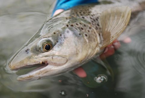 Midt ude i strømmen ser vi en ørred. Den ser ud til at være aktiv og slår ofte ud til siden for at tage små insekter. Sten, saks, papir om, hvem der skulle have chancen på ørreden. Jeg fik chancen og bandt en lille "Pheasant Tail" nymfe på det lange forfang. Usynligt sneg jeg mig om bag ved fisken, mens Nikolaj guider mig hen, hvor fisken helt præcist står. Første kast ligger en anelse bagved fisken, og Nikolaj giver besked på, at et kast en meter længere vil få nymfen ind i ørredens synsfelt. Fisken slår ud til siden, og Nikolaj råber: - Jaaah, den sidder der! Tilslaget kommer promte og ørreden rusker voldsomt. Fighten forløber forholdsvist uden dramatik, og fisken ligger efter kort tid i nettet. Turens første ørred og endda en flot eksemplar i slutningen af halvtredserne. Vi er begge overlykkelige over fangsten og fejrer ørreden med den lokale øl ved navn "Tui".