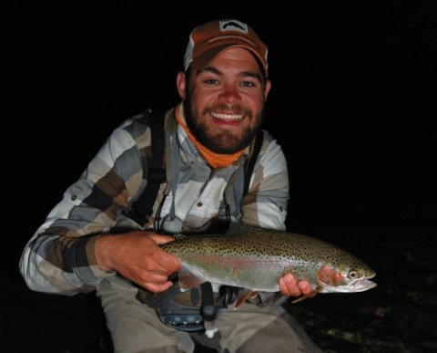 På turen har vi mødt en ligesindet nordmand, som også fisker ørreder her på sydøen. Han giver os et tip om et godt vandløb med mange fisk. Vi tager gladeligt imod rådet efter et par dage med kørsel frem og tilbage og uden fisk. For at gøre en lang historie kort byder den nye flod ikke på drømmefiskeri, men vi får et par fine regnbuer på land og mister tre, som alle springer vores forfang. Floden er omgivet af piletræer, og når de hidsige regnbuer kroges, ved de godt, hvor de skal smutte hen. Lige ind under træernes rødder! Meget af fiskeriet foregår i den sidste time, inden mørket falder på. Heftigt "evening rise" med mange fisk i overfladen. Natterodderi af værste skuffe.