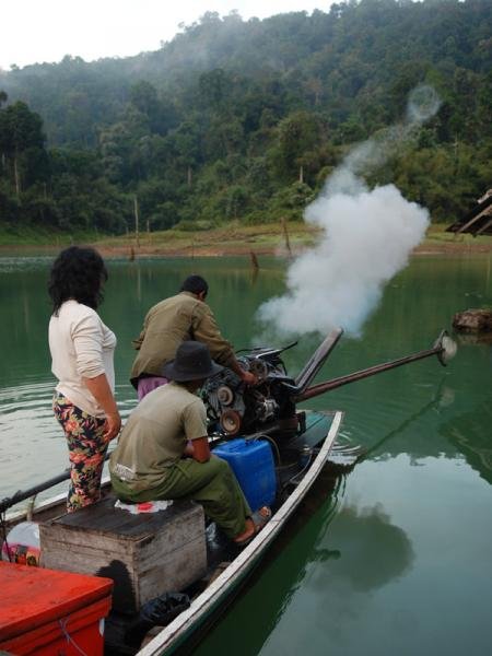 Vi skulle fiske efter giant snakehead i Cheow Lan Lake. Efter en hurtig introduktion til vores danske guide, blev vi kørt til Cheow Lan Lake og plantet i en longtailboat med en motor der mere end alt lignede et kæmpe piskeris. Båden blev fyldt med proviant og fiskegrej, så vi kunne klare os i 4 dage. Nu gik turen mod bungaloven, som var to timers sejlads væk.