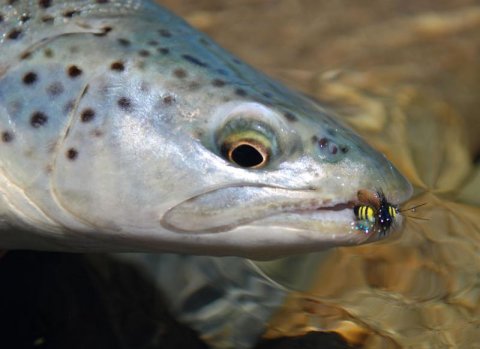 Vi ser dem tydeligt oppe fra skrænten, hvor vi sniger og frem i græsset mellem de spredte kolorte, som hver dag møger vores fisketøj ind. Kolort eller ej, vi får nogle fede billeder af ørrederne, og nu skal der fiskes på dem. Fluen bliver lagt ud, hvor vi forventer, at ørreden patruljerer. Bille-imitationen, som sidder på forfanget, bliver kort efter inhaleret. Ørreden er vildere end de andre flod-ørreder, vi har fanget, og det ses tydeligt hvorfor, da den krydser netrammen. Stor, fed og storprikket er den. Kameraet kører, så det næsten bliver varmt, og ørreden får sin frihed igen kort efter.