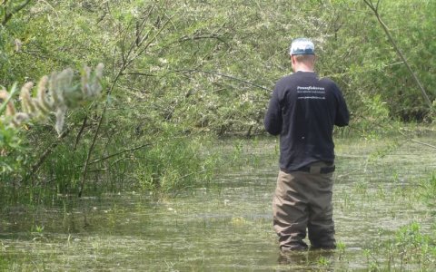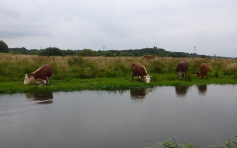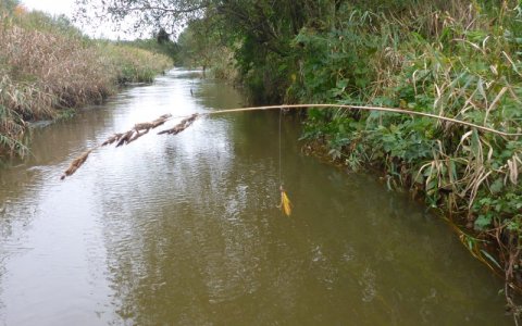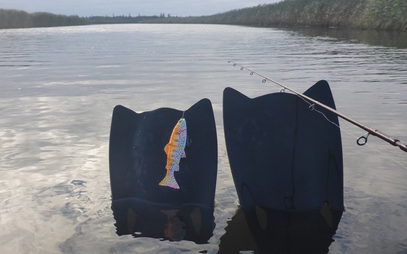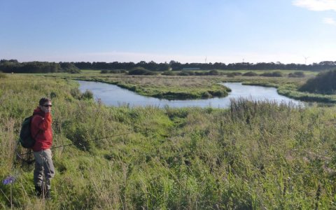 Og det fortsatte da flydering og fiskeatleten med vuggende tråd gled under Engbroen og på vej opstrøms til det forjættede rovfisk-reservat. Det kunne da give sved på panden - svømmefødder og lægmuskler versus den fortsatte strøm fra Stadil Fjord til Ringkøbing Fjord! Man måtte da holde sig til skyggen under den østlige breds rørskov for ikke at overophede ... mens man allerede var begyndt at glæde sig til det rolige drev nedstrøms igen i perfekt efterårsvejr. Et effektivt bagholdsangreb på ferskvandskrokodiller og sortstribede røvere var sat ind ...
