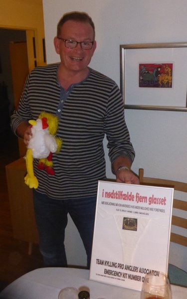 ![]() Lige før fiskeriet blæses af ... stopper regnen og striber af en herlig [...]blå himmel bryder stille frem ... vi kan i det mindste gennemføre indvejningen i tørvejr! Læs mere...↑ | ![]() Det klassiske "gruppefoto med fangst" ... Turisten ville med regnbueørreden på 48 cm/1250 gram have [...]vundet dysten med hele 100 grams forspring, hvis fiskeriet var sluttet efter 2 timer og 40 minutter ... men Pausefiskerens vinderfisk kort før tid var hele 52 cm/1700 gram! Hil Fiskekongen XXI. Hip, hip ... og så hjem og blive tør inden galla-middagen! Læs mere...↑ | ![]() Mens der tørres nærmer tilgivelsen sig ... Flinkfiskeren får tildelt diplomat-status ... selv [...]efter genkaldelsen af, hvilket fint vejr der var den første lørdag i september, hvor vi egentlig skulle have fisket årets Cup! Læs mere...↑ | |||